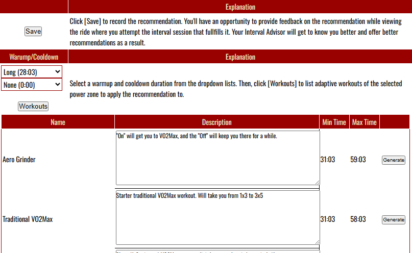 1. Make selections from the Warmup and Cooldown dropdown lists. Each Adaptive Workout has 15 combinations of warmup/cooldowns to accomodate different schedules and training plan volumes. 2. Click the [Workouts] button on the last row of the Interval Advisor recommendation. The workouts that your recommendation qualifies you for will be listed in a panel beneath the [Workouts] button. The list includes Min and Max times for each workout to help you choose a workout that works for your schedule.