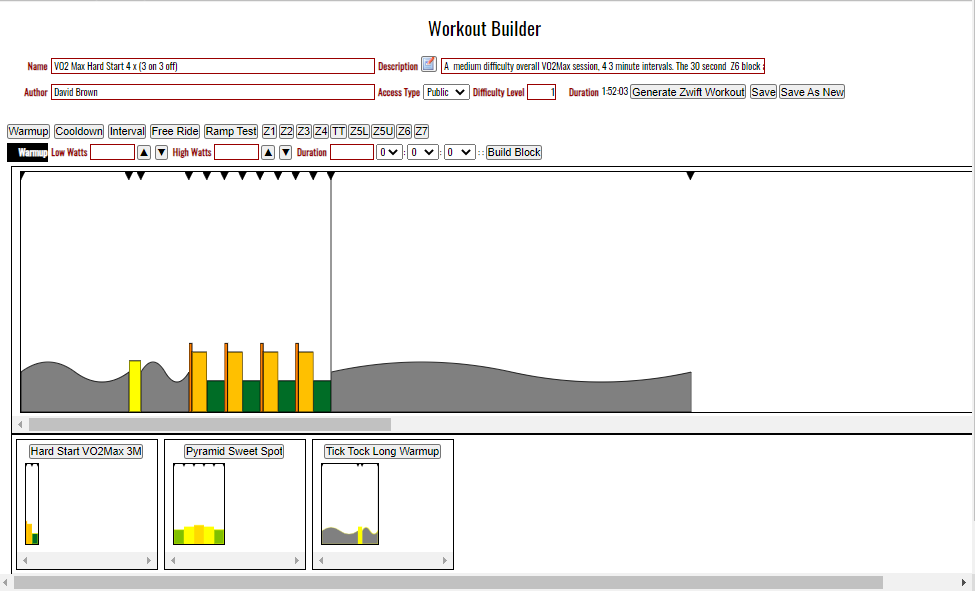 Here are "before" and "after" screens illustrating the editing process with [Save As New]. The second image shows the new workout that was added to the database by tweaking the existing one by adding an interval. Using [Save As New] on "VO2 Max Hard Start 3 x(3 on 3 off) has no effect on this workout in the database. It's only when you make changes and click [Save] that the original is updated on the database.