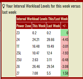 The Interval Workload Levels Insight Notification provides a this week vs last week view. If you're attempting to build fitness your levels in one or more zones should be rising.