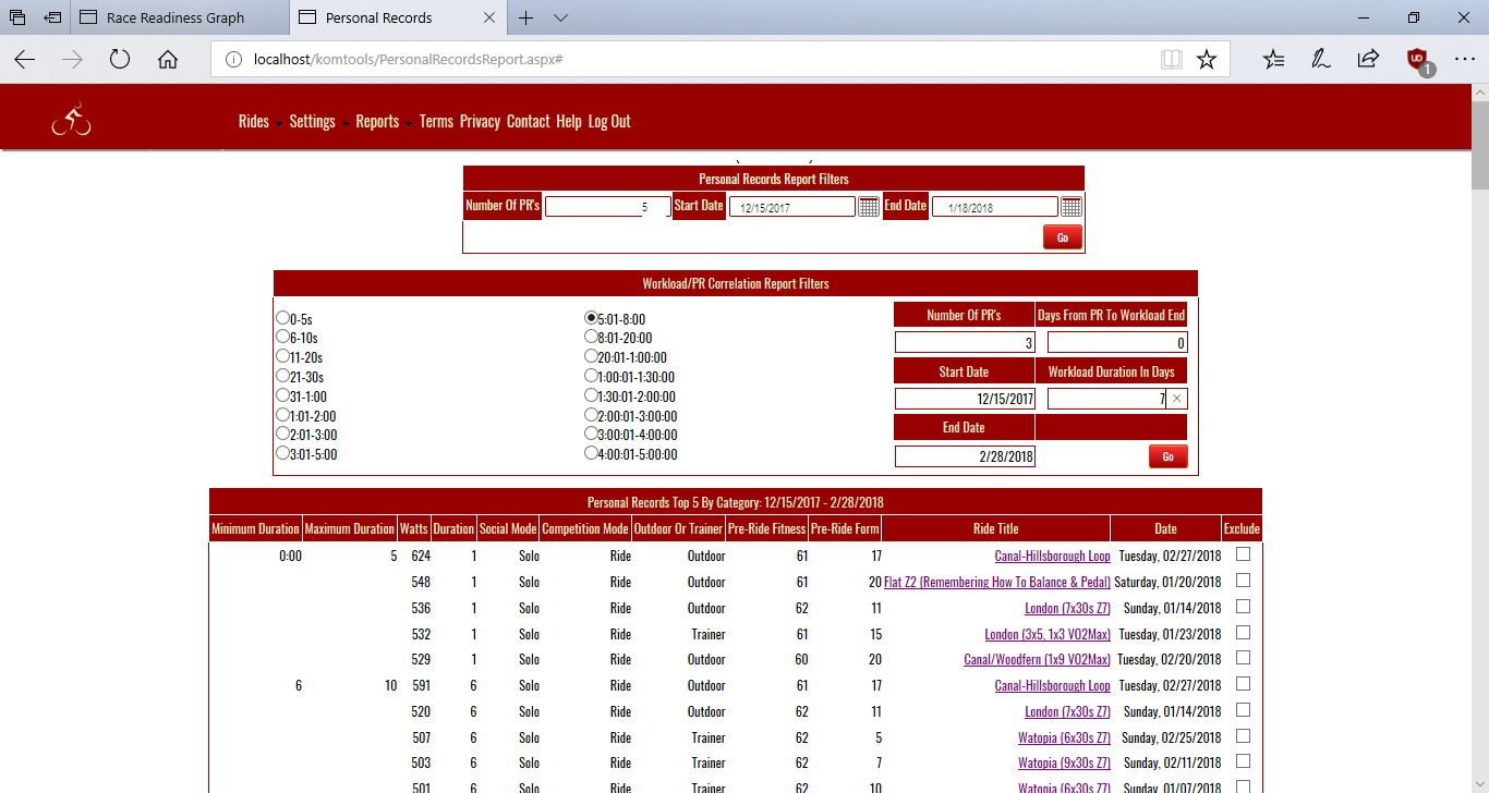 The report uses Personal Records wattages on the performance side. Although the system records personal records in 18 time buckets for each ride, we recognize that true attempts to best a PR are few and far between. This is the main reason why the Personal Records Report alllows you to limit the number of PR's returned by the report.