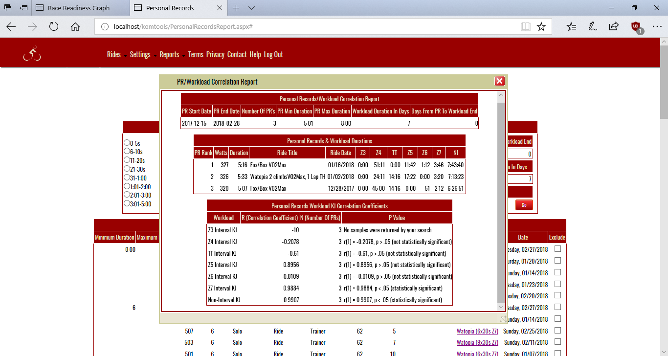 The Personal Records/Workload Correlation report provides information on the strength and direction of the linear relationship between your training and your performance. It can provide insights into which aspects of your trainiing are having the biggest effect on the performance abilities that can make a critical difference to your success as a competitive cyclist.