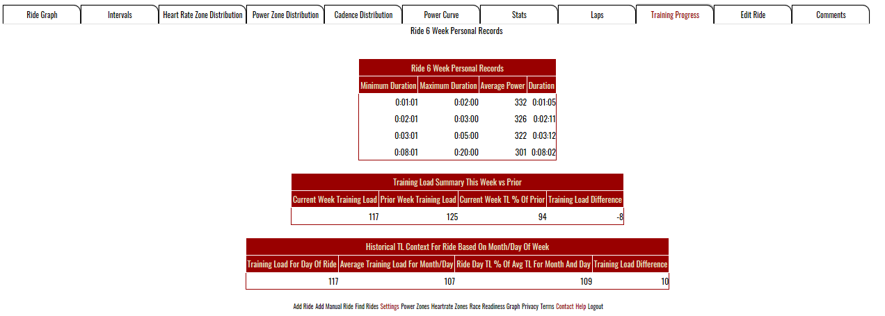 The last table on the page shows the historical training load context for the ride based on month and day. If your ride occured on a Tuesday in January the system would show you an average training load for all Tuesday rides from January which occured prior to the day's ride.