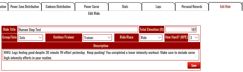 Here's the Comments field of a ride page that the above chart is reporting on: