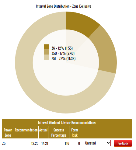 The interface shows the Power Zone, the Recommendation, your interval performance for that Power Zone, along with the Success Percentage (Actual/Recommendation), and also the Form Risk associated with the Recomendation. The latter is an estimate of how your Form could potentially affect your ability to perform the interval session.