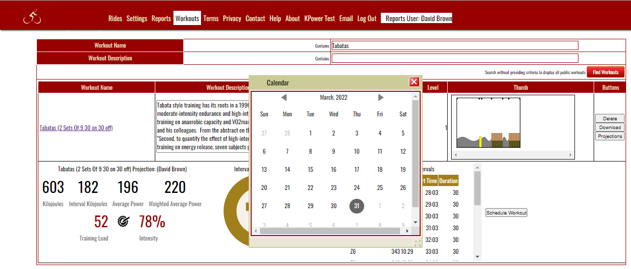 - Click on the [Schedule] button on the right hand side of the Workout Projection panel. A popup calendar will display.