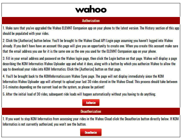 3. Fill in your email address and password on the Wahoo login page, then click the Login button on that page. Wahoo will display a page describing the KOM Informatics Wahoo Uploader app and what it does, along with a button by which you authorize Wahoo to allow the app to download your rides into KOM Informatics. Click the [Authorize] button on that page.